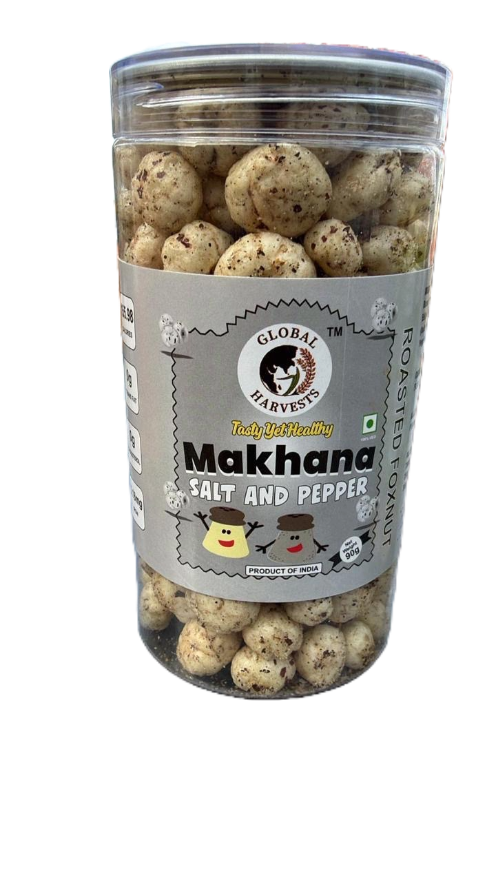 Global Harvests Makhana Salt and Pepper is a light and healthy snack made from popped lotus seeds (makhana). This 90g package offers a savory and subtly spicy flavor profile thanks to the classic combination of salt and pepper. Makhana is naturally gluten-free, low in calories, and a good source of protein and fiber, making it a guilt-free alternative to traditional chips and other processed snacks. Enjoy it straight from the bag for a quick energy boost, as a topping for salads, or as a crunchy addition to your favorite dishes.