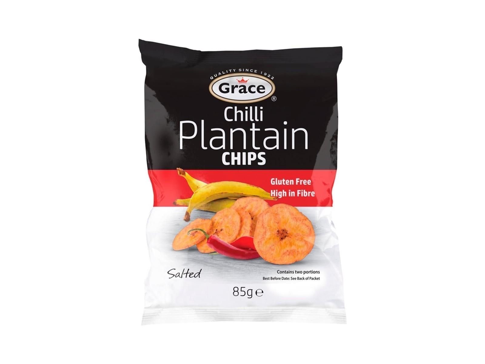 GRACE Chilli Plantain Chips 85G: Indulge in the bold and flavorful snacking experience of our spicy and crunchy plantain chips, made with real chili. Each pack contains 85g of delicious GRACE Chilli Plantain Chips.