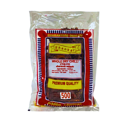 SHANKAR WHOLE DRY CHILLI (STEMLESS) 500G: Premium whole dry chillies without stems, ideal for spicing up your culinary creations.