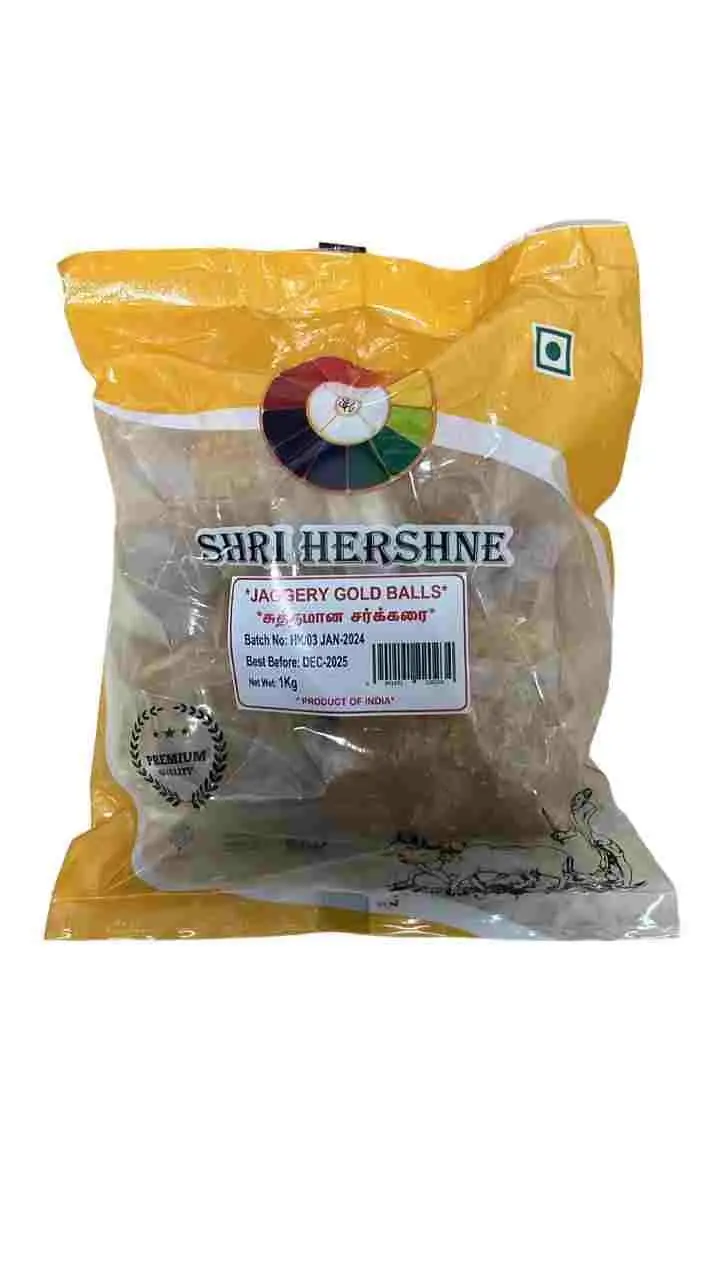 SHRI HERSENE JAGGERY GOLD BALLS 1KG: Indulge in the pure and natural sweetness of these high-quality jaggery balls, crafted from premium sugarcane. Enhance your favorite dishes and beverages with a touch of rich sweetness.